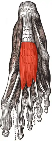 ![]() Muscles of the sole of the foot. First layer. (Flexor digitorum brevis visible at center.) | |