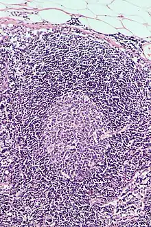 Follicular hyperplasia (FH) is a type of lymphoid hyperplasia and is classified as a lymphadenopathy, which means a disease of the lymph nodes. It is caused by a stimulation of the B cell compartment and by abnormal cell growth of secondary follicles. This typically occurs in the cortex without disrupting the lymph node capsule.[1] The follicles are pathologically polymorphous, are often contrasting and varying in size and shape.[2] Follicular hyperplasia is distinguished from follicular lymphoma in its polyclonality and lack of bcl-2 protein expression, whereas follicular lymphoma is monoclonal, and expresses bcl-2.[3]