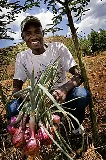 Intensive farming often leads to a vicious cycle of exhaustion of soil fertility and a decline of agricultural yields.[77] Other causes of land degradation include deforestation, overgrazing, over-exploitation of vegetation for use.[78] Approximately 40 percent of the world's agricultural land is seriously degraded.[79]