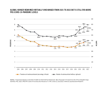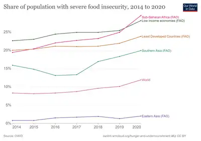 Recent editions of the SOFI report (The State of Food Security and Nutrition in the World) present evidence that the decades-long decline in hunger in the world, as measured by the number of undernourished (NoU), has ended. In the 2020 report, FAO used newly accessible data from China to revise the global NoU downwards to nearly 690 million, or 8.9 percent of the world population – but having recalculated the historic hunger series accordingly, it confirmed that the number of hungry people in the world, albeit lower than previously thought, had been slowly increasing since 2014. On broader measures, the SOFI report found that far more people suffered some form of food insecurity, with 3 billion or more unable to afford even the cheapest healthy diet.[33] Nearly 2.37 billion people did not have access to adequate food in 2020 – an increase of 320 million people compared to 2019.[34][35]