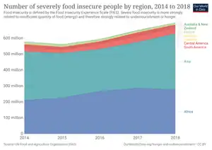 Famine and hunger are both rooted in food insecurity. Chronic food insecurity translates into a high degree of vulnerability to famine and hunger; ensuring food security presupposes the elimination of that vulnerability.[60]