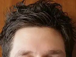 In human anatomy, the forehead is an area of the head bounded by three features, two of the skull and one of the scalp. The top of the forehead is marked by the hairline, the edge of the area where hair on the scalp grows. The bottom of the forehead is marked by the supraorbital ridge, the bone feature of the skull above the eyes. The two sides of the forehead are marked by the temporal ridge, a bone feature that links the supraorbital ridge to the coronal suture line and beyond.[1][2] However, the eyebrows do not form part of the forehead.