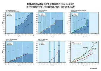 - ↑ The American Academy of Pediatrics Task Force on Circumcision "Technical Report" (2012) addresses sexual function, sensitivity and satisfaction without qualification by age of circumcision. Sadeghi-Nejad et al. "Sexually transmitted diseases and sexual function" (2010) addresses adult circumcision and sexual function. Doyle et al. "The Impact of Male Circumcision on HIV Transmission" (2010) addresses adult circumcision and sexual function. Perera et al. "Safety and efficacy of nontherapeutic male circumcision: a systematic review" (2010) addresses adult circumcision and sexual function and satisfaction.