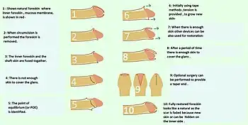 Foreskin restoration is the process of expanding the skin on the penis to reconstruct an organ similar to the foreskin, which has been removed by circumcision or injury. Foreskin restoration is primarily accomplished by stretching the residual skin of the penis, but surgical methods also exist. Restoration creates a facsimile of the foreskin, but specialized tissues removed during circumcision cannot be reclaimed. Actual regeneration of the foreskin is experimental at this time. Some forms of restoration involve only partial regeneration in instances of a high-cut wherein the circumcisee feels that the circumciser removed too much skin and that there is not enough skin for erections to be comfortable.[1]