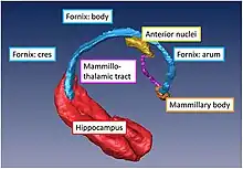 - ↑ Reviewed by Senova, S; Fomenko, A.; Gondard, E.; Lozano, A. M. (2020). "Anatomy and function of the fornix in the context of its potential as a therapeutic target". Journal of Neurology, Neurosurgery & Psychiatry. 91 (5): 547–559. doi:10.1136/jnnp-2019-322375. PMC 7231447. PMID 32132227.