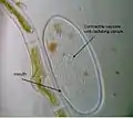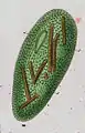 Frontonia sp., specimen is digesting cyanobacteria, the mouth (cytostome) is at the bottom right. | |