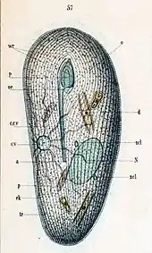 Frontonia species vary in length from 50 to 600 micrometres.[6] Cell bodies are typically ovoid or elongate, and somewhat flattened from back to front. They are flexible, uniformly ciliated, and usually surrounded by trichocysts. The small oral aperture is pear-shaped, and located in the anterior half of the cell.[7] Along the left side of the opening there are three membranelles, and the right has a single paroral membrane. The mouth is supported by inconspicuous microtubular rods (nematodesmata),[8] and may expand during feeding to as much as two-thirds of the cell's length.[9]