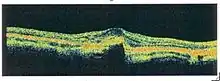 An optical coherence tomography (OCT) of the retina, showing a Fuchs spot |