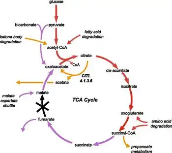 Fumarase deficiency is one of the few known deficiencies of the Krebs cycle or tricarboxylic acid cycle, the main enzymatic pathway of cellular aerobic respiration.[7]