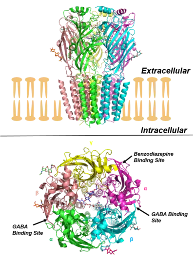 Structure of the GABAA receptor (α1β1γ2S: PDB: 6DW1). Top: side view of the GABAA receptor embedded in a cell membrane. Bottom: view of the receptor from the extracellular face of the membrane. The subunits are labeled according to the GABAA nomenclature and the approximate locations of the GABA and benzodiazepine (BZ) binding sites are noted (between the α- and β-subunits and between the α- and γ-subunits respectively).