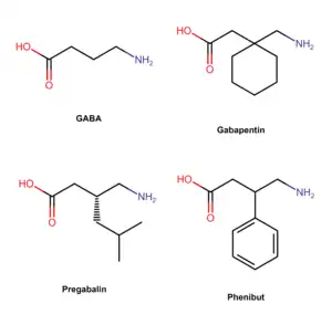 The gabapentinoids are 3-substituted derivatives of GABA; hence, they are GABA analogues, as well as γ-amino acids.[3][4] Specifically, pregabalin is (S)-(+)-3-isobutyl-GABA, phenibut is 3-phenyl-GABA,[15] and gabapentin is a derivative of GABA with a cyclohexane ring at the 3 position (or, somewhat inappropriately named, 3-cyclohexyl-GABA).[36][37][38] The gabapentinoids also closely resemble the α-amino acids L-leucine and L-isoleucine, and this may be of greater relevance in relation to their pharmacodynamics than their structural similarity to GABA.[2][19][36]
