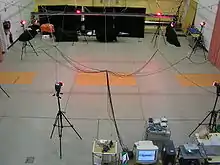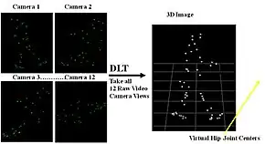 - Passive marker systems, using reflective markers (typically reflective balls), allows for accurate measurement of movements using multiple cameras (typically five to twelve cameras), simultaneously. The cameras utilize high-powered strobes (typically red, near infrared or infrared) with matching filters to record the reflection from the markers placed on the body. Markers are located at palpable anatomical landmarks. Based on the angle and time delay between the original and reflected signal, triangulation of the marker in space is possible. Software is used to create three dimensional trajectories from these markers that are subsequently given identification labels. A computer model is then used to compute joint angles from the relative marker positions of the labeled trajectories.[12] These are also used for motion capture in the motion picture industry.[13]