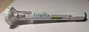 Galcanezumab, sold under the brand name Emgality, is a medication used to prevent migraines and treat cluster headaches.[1] It is given by injection under the skin.[1] Benefits may take up to three months.[1]