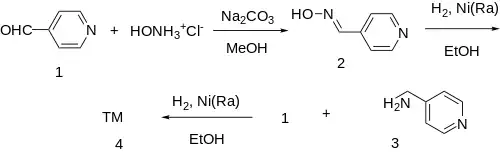 The oxime formation between isonicotinaldehyde [872-85-5] (1) and hydroxylamine gives 4-Pyridinealdoxime [696-54-8] (2). This is then reduced by catalytic hydrogenation over Raney-Nickel into 4-Picolylamine [3731-53-1] (3). Reductive amination of the last with a second equivalent of isonicotinaldehyde affords gapicomine (4).