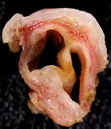 A Gartner's duct cyst (sometimes incorrectly referred to as vaginal inclusion cyst) is a benign vaginal cyst that originates from the Gartner's duct, which is a vestigial remnant of the mesonephric duct (Wolffian duct) in females.[1][2] Persistent Wolffian duct syndrome (PWDS) in individuals with XX chromosomes is the inverse disorder of Persistent Müllerian duct syndrome (PMDS) in individuals with XY chromosomes. They are typically small asymptomatic cysts that occur along the lateral walls of the vagina, following the course of the duct. They can present in adolescence with painful menstruation (dysmenorrhea) or difficulty inserting a tampon. They can also enlarge to substantial proportions and be mistaken for urethral diverticulum or cystocele.[3][4] In some rare instances, they can be congenital.[2]