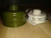 - Gas mask used by the French military. The filter cartridge is connected via a flexible hose.