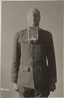 Also in World War I, since dogs were frequently used on the front lines, a special type of gas mask was developed that dogs were trained to wear.[21] Other gas masks were developed during World War I and the time following for horses in the various mounted units that operated near the front lines.[22] In America, thousands of gas masks were produced for American as well as Allied troops. Mine Safety Appliances was a chief producer. This mask was later used widely in industry.[23]