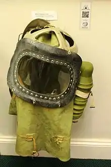 Early versions were constructed by the Scottish chemist John Stenhouse in 1854[8] and the physicist John Tyndall in the 1870s.[9] Another early design was the "Safety Hood and Smoke Protector" invented by Garrett Morgan in 1912, and patented in 1914. It was a simple device consisting of a cotton hood with two hoses which hung down to the floor, allowing the wearer to breathe the safer air found there. In addition, moist sponges were inserted at the end of the hoses in order to better filter the air.[10][11]
