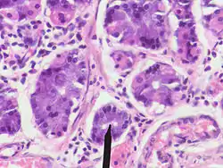 A gastric chief cell, peptic cell, or gastric zymogenic cell is a type of gastric gland cell that releases pepsinogen and gastric lipase. It is the cell responsible for secretion of chymosin in ruminant animals and humans.[1] The cell stains basophilic upon H&E staining due to the large proportion of rough endoplasmic reticulum in its cytoplasm. Gastric chief cells are generally located deep in the mucosal layer of the stomach lining, in the fundus and body of the stomach.[2][3]