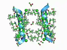 Chloride channels are another group of voltage gated ion channels, of which are less understood. They are involved with processes such as skeletal and cardiac smooth muscle, cell volume regulation, the cell cycle, and apoptosis.[18] One major family of chloride proteins are called CLC proteins, functionally categories into channel or transporter.[19] They share homodimeric structure with independent ion permeation pathway in each of the subunit.[20] Based on functional characterization, there are two known gating mechanism: protopore and common gating. The protopore gating, also known as fast gating, is associated with occlusion of the pore via side-chain of conserved glutamate. While the common gating, also known as the slow gating, inactivated or reactivates both pores through unknown mechanism.[21] This family either transports two chloride for one proton or simply allows flux down its electrochemical gradient.[22] With this channel the correct depolarization and repolarization via chloride ions is essential for propagation of an action potential.[18]