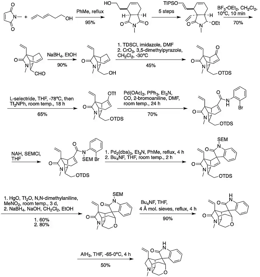 Eight further total syntheses have been reported in the literature, including from the groups of A.P. Johnson in 1994, T. Fukuyama in 1996 and again in 2000, D.J. Hart in 1997, L.E. Overman in 1999, S.J. Danishefsky in 2002, and Y. Qin in 2012, with the latter Fukuyama group synthesis (31 steps, 0.86%) and the Qin group synthesis (25 steps, 1%) being asymmetric.[30][31][32][33][34][35][36][9] A further asymmetric synthesis using an organocatalytic Diels–Alder approach from the F.G. Qiu and H. Zhai groups in China, reporting a remarkable 12 steps and a 5% yield, was reported in 2015.[9] Additional synthetic approaches were discussed by notable scientists such as Fleming, Stork, Penkett, Pearson, Aubé, Vanderwal, and Simpkins.[37]