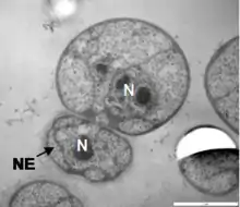 Electron micrograph of G. obscuriglobus in the process of dividing by budding. Labels indicate the nucleoid (N) of the mother (larger) and daughter (smaller) cells, and the nucleoid envelope (NE) of the daughter cell, which is described as not yet fully formed. Scale bar = 1μm.[18]