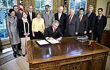Genetic discrimination is illegal in the U.S. after passage of the Genetic Information Nondiscrimination Act (GINA) on May 21, 2008.[9] It was signed into law by President George W. Bush, and passed in the US Senate by a vote of 95–0 and in the House of Representatives by 414–1.[10] The legislation bars employers from using individuals' genetic information when making hiring, firing, job placement, or promotion decisions.[4] GINA also protects individuals from genetic discrimination in healthcare;[11] however, GINA itself does not define what genetic information is, leaving it up for debate.[12] Prior to the 2008 GINA Act, individuals could be denied insurance, either partially or fully, based on genetic tests they had received.[13]