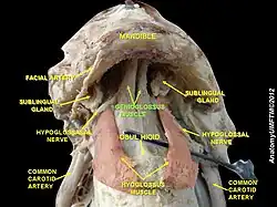 Its insertions are the hyoid bone and the bottom of the tongue.[1][2]