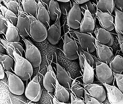 - 1 2 Adam RD (July 2001). "Biology of Giardia lamblia". Clin. Microbiol. Rev. 14 (3): 447–75. doi:10.1128/CMR.14.3.447-475.2001. PMC 88984. PMID 11432808.
