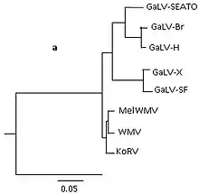 These strains exhibit high genetic similarity, demonstrated through DNA sequencing which reveals approx. 90% sequence identity and more than 93% amino acid genome identity between strains of GaLV. Differences between these strains occurs in the env gene, with divergence ranging from 85% to 99%.[4]