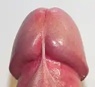 In male human anatomy, the glans penis or penile glans,[2] commonly referred to as the glans, (/ɡlænz/; from Latin glans meaning "acorn")[3] is the bulbous structure at the distal end of the human penis that is the human male's most sensitive erogenous zone and primary anatomical source of sexual pleasure.[4][5] The glans penis is present in the male reproductive organs of humans and most other mammals where it may appear smooth, spiny, elongated or divided.[6] It is externally lined with mucosal tissue, which creates a smooth texture and glossy appearance. In humans, the glans is located over the distal ends of the corpora cavernosa and is a continuation of the corpus spongiosum of the penis. At the summit appears the urinary meatus and at the base forms the corona glandis. An elastic band of tissue, known as the frenulum, runs on its ventral surface. In men who are not circumcised, it is completely or partially covered by a fold of skin called the foreskin. In adults, the foreskin can generally be retracted over and past the glans manually or sometimes automatically during an erection.[7]