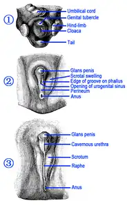 The glans penis develops as the terminal end of the genital tubercle during the embryonic development of the male fetus. The tubercle is present in the embryos of both sexes as an outgrowth in the caudal region that later develops into a primordial phallus. Exposure to male hormones (androgens) initiates the tubercle's development into a penis making the glans penis anatomically homologous to the clitoral glans in females.[8][9]