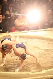 Glare from a camera flash during a Sumo fight