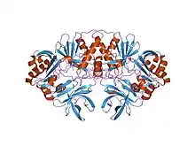 In the enzymatic reaction, H-protein activates the P-protein, which catalyzes the decarboxylation of glycine and attaches the intermediate molecule to the H-protein to be shuttled to the T-protein.[4][5] The H-protein forms a complex with the T-protein that uses tetrahydrofolate and yields ammonia and 5,10-methylenetetrahydrofolate. After interaction with the T-protein, the H-protein is left with two fully reduced thiol groups in the lipoate group.[6] The glycine protein system is regenerated when the H-protein is oxidized to regenerate the disulfide bond in the active site by interaction with the L-protein, which reduces NAD+ to NADH and H+.