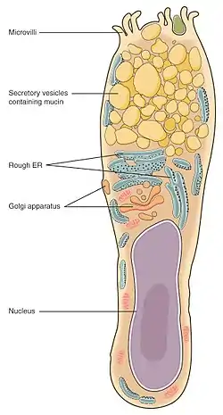 Goblet cells are simple columnar epithelial cells that secrete gel-forming mucins, like mucin 2 in the gastrointestinal tract, and mucin 5AC in the respiratory tract.[1] The goblet cells mainly use the merocrine method of secretion, secreting vesicles into a duct, but may use apocrine methods, budding off their secretions, when under stress.[2] The term goblet refers to the cell's goblet-like shape. The apical portion is shaped like a cup, as it is distended by abundant mucus laden granules; its basal portion lacks these granules and is shaped like a stem.