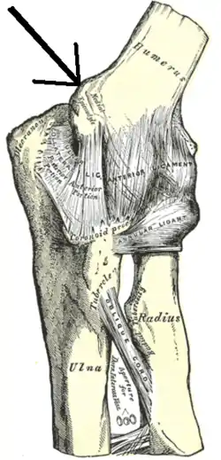 Golfer's elbow, or medial epicondylitis, is tendinosis (or more precisely enthesopathy) of the medial common flexor tendon on the inside of the elbow.[1] It is similar to tennis elbow, which affects the outside of the elbow at the lateral epicondyle. The tendinopathy results from overload or repetitive use of the arm, causing an injury similar to ulnar collateral ligament injury of the elbow in "pitcher's elbow".[1]