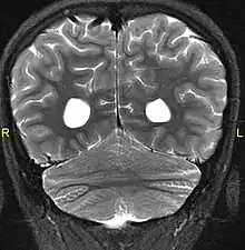Aside from the physical characteristics of the eyes there is also less sensation in the eyes when stimulated.[4] The eyes also show low motor control (ataxia).[4] Along with ataxia comes a lack of coordination or ability to judge the distance of objects (dysmetria).[6] MRIs show a constant feature of rhombencephalosynapsis–a condition marked by the absence or partial absence of the cerebellar vermis and varying degrees of fusion in the cerebellum in every case of Gómez–López-Hernández syndrome.[4][7][8] Also absent are the trigeminal nerve of the trigeminal cave and the foramen rotundum, causing abnormal sensations on the forehead and the corneas.[6][8] One Gómez–López-Hernández syndrome case in Japan also presents fever-induced seizures.[9] Others may or may not present with non-fever-induced seizures.[4] Malformations of motor centers in the brain cause reduced muscle strength (hypotonia).[8] Eleven of fifteen people in one study showed moderate-to-severe intellectual disability.[6] In cases where it has been noted, head nodding is present.[6] Hydrocephalus and enlargement of the ventricular system is consistently present.[6] A reduced corpus callosum is present in some cases (agenesis of the corpus callosum).[6]