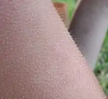 Goose bumps, goosebumps or goose-pimples[1] (also called chill bumps) are the bumps on a person's skin at the base of body hairs which may involuntarily develop when a person is tickled, cold or experiencing strong emotions such as fear, euphoria or sexual arousal.[2]