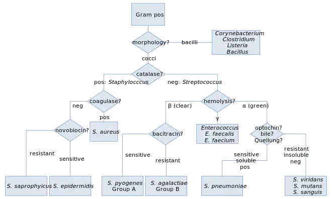Along with cell shape, Gram staining is a rapid method used to differentiate bacterial species. Such staining, together with growth requirement and antibiotic susceptibility testing, and other macroscopic and physiologic tests, forms the full basis for classification and subdivision of the bacteria (e.g., see figure and pre-1990 versions of Bergey's Manual of Systematic Bacteriology).