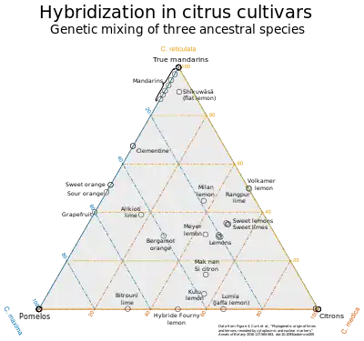Citrus fruits clustered by genetic similarity. Most commercial varieties of citrus are hybrids of the three species at the corners of the ternary diagram, and genetically distinct hybrids often bear the same common name.[32] Fucomarin production has been inherited by some hybrid cultivars; others have not inherited the fucomarin-producing genes.