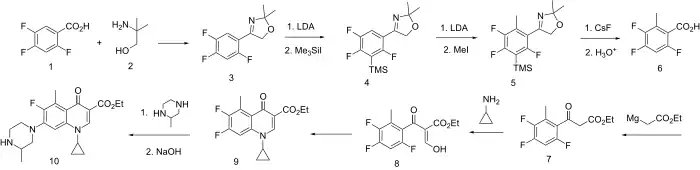 The scheme starts with the conversion of the carboxylic acid in (1) to its dimethyloxazoline derivative (3) by reaction with the aminomethyl propanol (2). Lithium diisopropylamide (LDA) then removes a proton from the 8 position; treatment of that anion with trimethylsilyl iodide leads to the silylated intermediate (4). A second round of LDA then generates a carbanion at the only open position; reaction with methyl iodide leads to the corresponding 5 methyl derivative (5). Treatment of that product with cesium fluoride breaks the carbon–silicon bond, removing the silyl group; aqueous acid then hydrolyzes the oxazoline to afford the free acid (6). This last intermediate is then taken on to the quinolone (9) [13] by essentially the same scheme as that used to prepare difloxacin, with the difference that the chain elongation is by means of Grignard reagent of ethyl bromoacetate. Treatment of (9) with 2-methylpiperazine proceeds by reaction at the less hindered of the two amino groups; saponification then affords grepafloxacin (10).