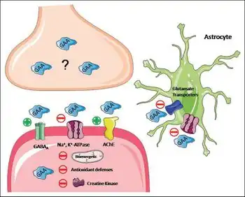(Suggested) mechanisms of neurochemical effects of GAA accumulation in the brain. Under GAMT deficiency, there is uptake of GAA from the periphery and GAA synthesis in the neuron occurring mainly in the mitochondria intermembrane space via AGAT.[1] | |