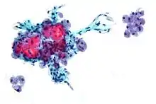 Micrograph showing Hürthle cells in a Hürthle cell neoplasm. Pap stain. | |