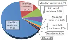 Relative incidences of malignant thyroid tumors, with Hürthle cell carcinoma near top right.