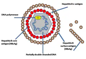 HBeAg is an antigen that can be found between the icosahedral nucleocapsid core and the lipid envelope (the outer most layer of the hepatitis b virus). However, HBeAg is considered "nonparticulate" or "secretory".[2] While both HBeAg and HBcAg are made from the same reading frame (multiple protein products can be produced from the same DNA sequence and when the genes "ORF Core" and "Pre C" are translated together, the result is HBeAg), HBeAg is secreted and accumulates in serum as an immunologically distinct soluble antigen. Hence the reason why the presence of both proteins together acts as a marker of viral replication, and why antibodies to these antigens are a marker of declining replication. The presence of HBeAg in the serum of patients can serve as a marker of active replication in chronic hepatitis.