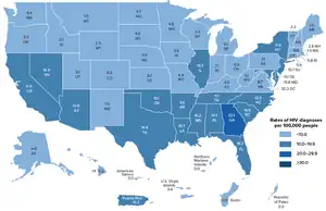 According to CDC estimates, the most common transmission category of new infections remained male-to-male sexual contact, which accounted for roughly 66.6% of all new infections in the United States in 2017.[98] With regard to region of residence, the highest rates of new infections in 2017 occurred in the United States South, with 19,968 total new infections and 16.1 infections per 100,000.[98] The region identified as 'South' includes Alabama, Arkansas, Delaware, District of Columbia, Florida, Georgia, Kentucky, Louisiana, Maryland, Mississippi, North Carolina, Oklahoma, South Carolina, Tennessee, Texas, Virginia, and West Virginia.[98]