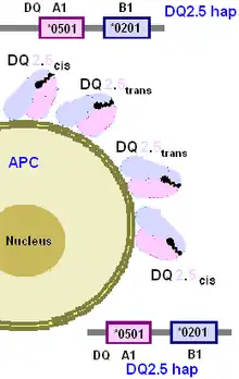 As mentioned the DQA1*0501:DQB1*0201 haplotype produces DQ2.5cis which by frequency and efficiency in alpha-gliadin presentation is the major factor in adaptive immunity. The isoform, referred to frequently as the DQ2 heterodimer or DQ2 (DQA1*05:DQB1*02) and more recently DQ2.5 can be differentiated from responses from other DQ isoforms, including other DQ2.[8][9] Specifically, that this DQ2 heterodimer is responsible for presenting the α2-gliadin that most effectively stimulates pathogenic T-cells.