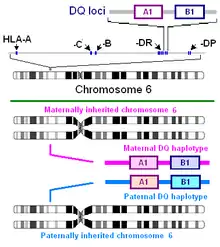 - ↑ Louka A, Nilsson S, Olsson M, Talseth B, Lie B, Ek J, Gudjónsdóttir A, Ascher H, Sollid L (2002). "HLA in coeliac disease families: a novel test of risk modification by the 'other' haplotype when at least one DQA1*05-DQB1*02 haplotype is carried". Tissue Antigens. 60 (2): 147–54. doi:10.1034/j.1399-0039.2002.600205.x. PMID 12392509.