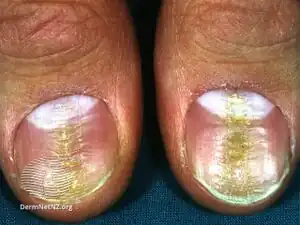 - ↑ Pathania, Vikas (2016). "Median Canaliform Dystrophy of Heller occurring on thumb and great toe nails". Medical Journal, Armed Forces India. 72 (2): 178–179. doi:10.1016/j.mjafi.2015.06.020. ISSN 0377-1237. PMC 4878880. PMID 27257330.