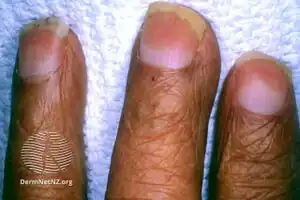 Half and half nails, also known as Lindsay's nails,[1] show the proximal portion of the nail white and the distal half red, pink, or brown, with a sharp line of demarcation between the two halves.[2]:785 Seventy percent of hemodialysis patients and 56% of renal transplant patients have at least one type of nail abnormality. Absence of lunula, splinter hemorrhage, and half and half nails were significantly more common in hemodialysis patients, while leukonychia was significantly more common in transplant patients.[2]:785[3]:659